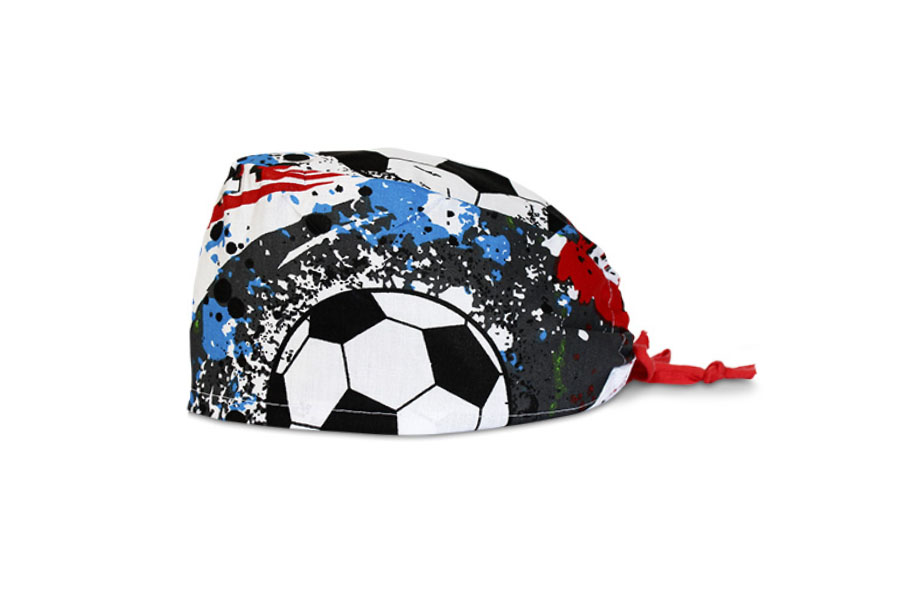 Czepek medyczny #9A uszyty z materiału 100% bawełnianego w motywy piłkarskie. Kolory na czepku niebieski, czerwony, czarny. Wiązany na troczek z tyłu głowy. Rozmiar uniwersalny.