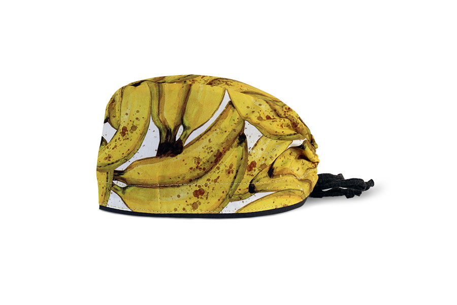 Czepek medyczny PREMIUM #banany – uszyty z materiału 100% bawełnianego w dojrzałe banany. Posiada komfortową frotkę wszytą na wysokości czoła po wewnętrznej stronie oraz wzmacniającą lamówkę. Wiązany na troczek z tyłu głowy. Rozmiar uniwersalny. Rozłożenie wzoru na materiale losowe.